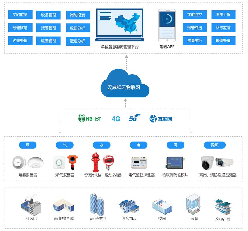 采用3G/4G/LoRa/NB-IOT等最先进物联网手段,结合监控视频联动调度,无死角全方位监控消防安全重点区域。