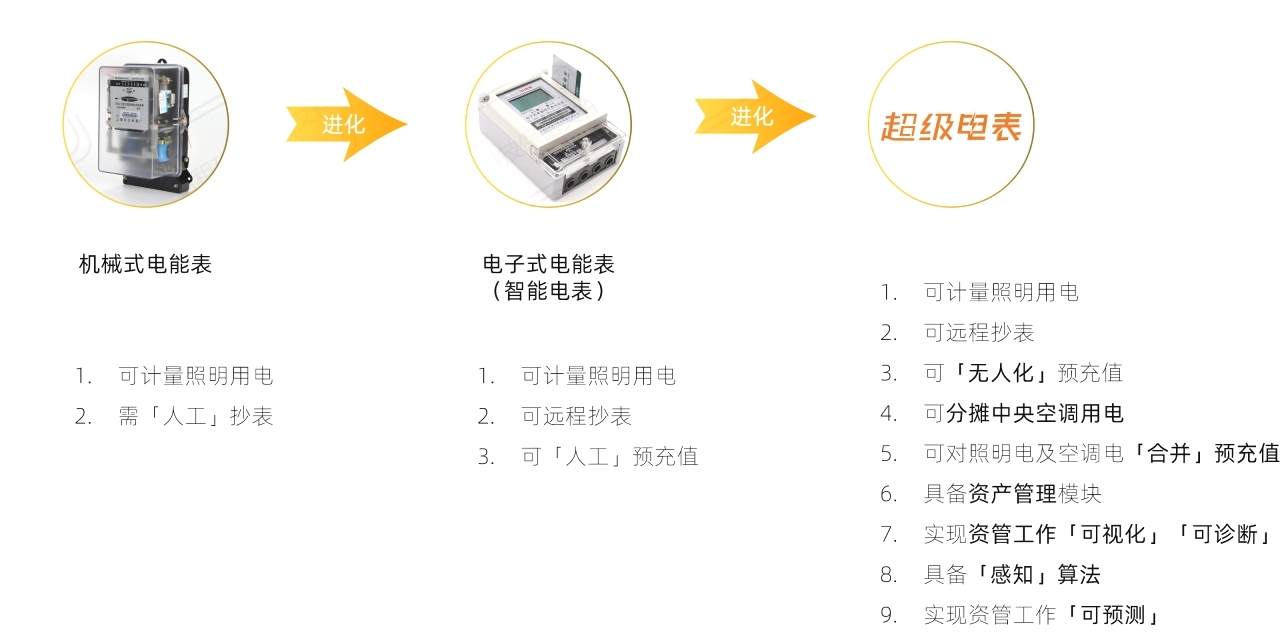 超级电表可实现3套系统、8大管理模块、N个子项管理功能。3套系统分别为智慧电力管理系统、空调能耗分摊系统、租约在线管理系统;8大管理模块分别为权限管理、能耗管理、预付费管理、租约管理、运营管理、财务管理、硬件管理、数据大屏;N个字项管理功能包括单账号多园区管理、实时远程抄表、空调能耗分摊、能耗预缴机制、多表统一支付、余额不足预警、欠费自动断电、远程断电供电、租控流程在线、智能催租提醒、空置房运营管理、核心经营数据统计、感知预测退租行为等等。
